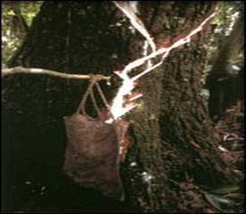 Cuts on the sapodilla tree let the sap run into a collection bucket. |